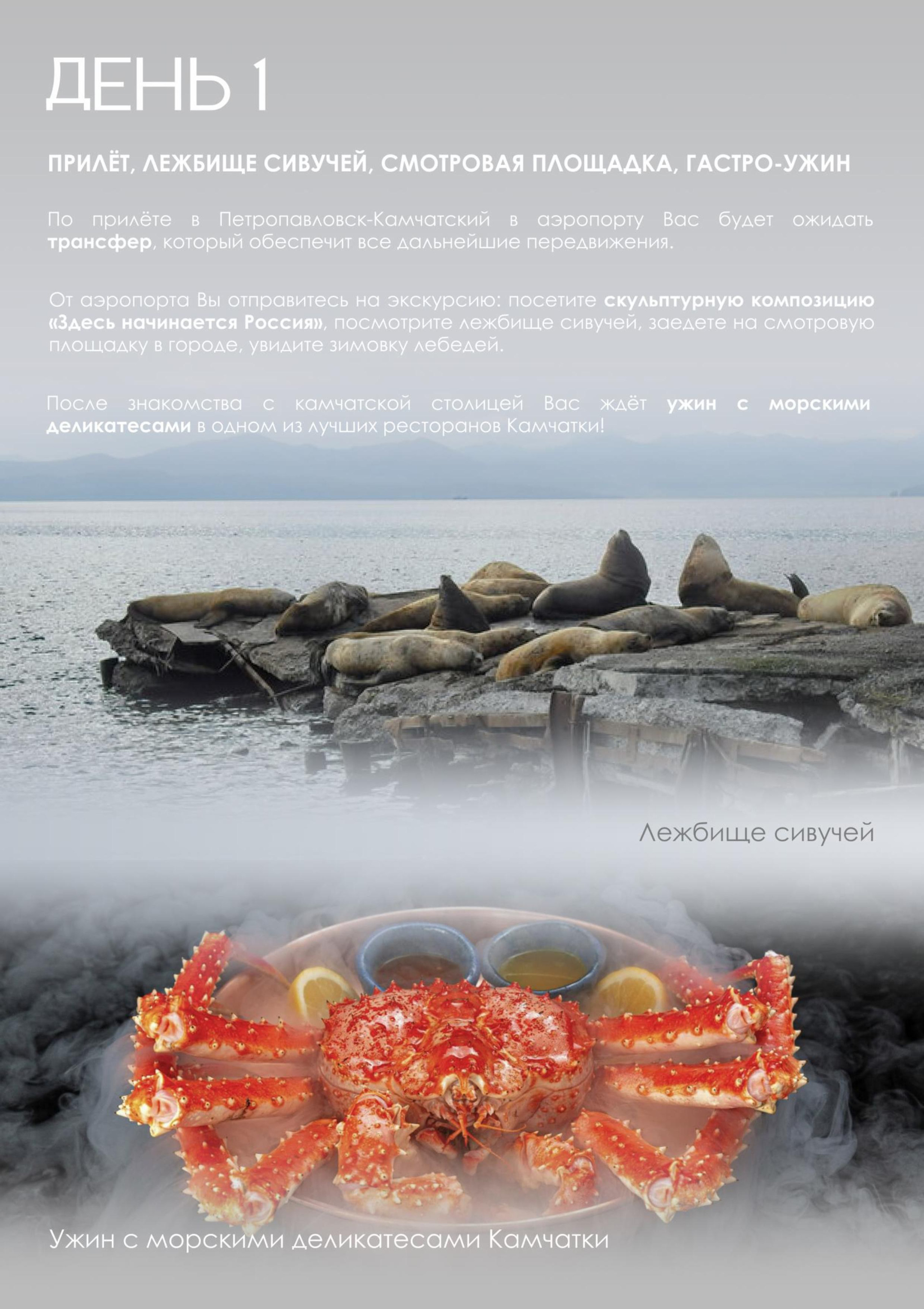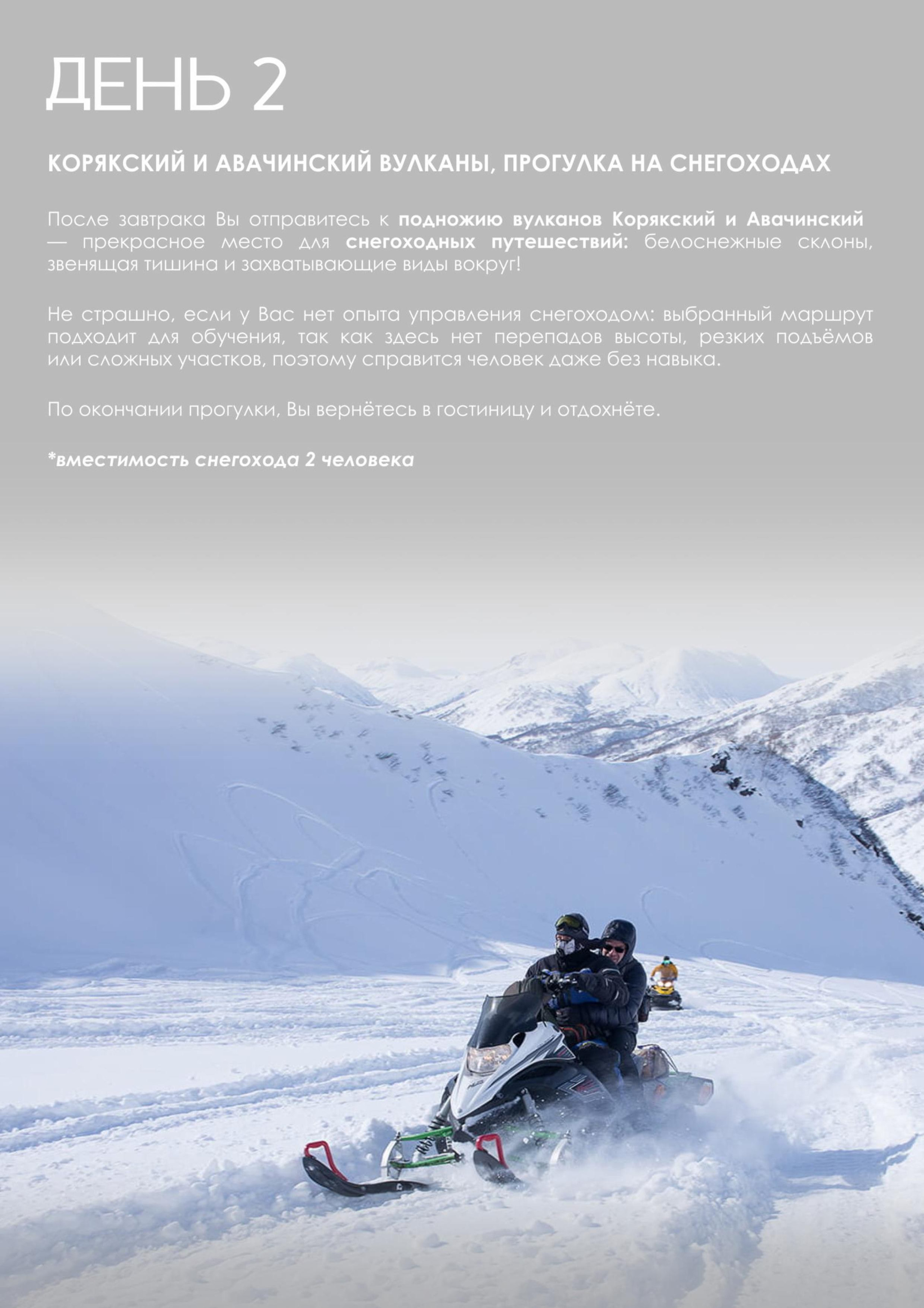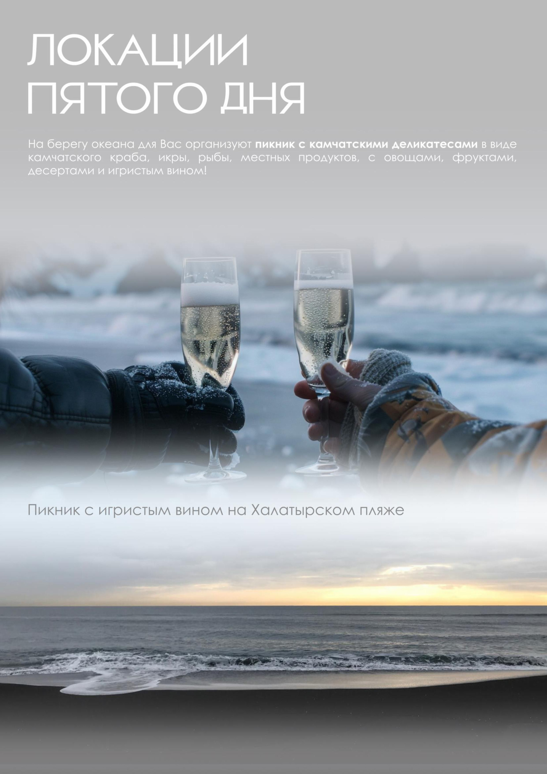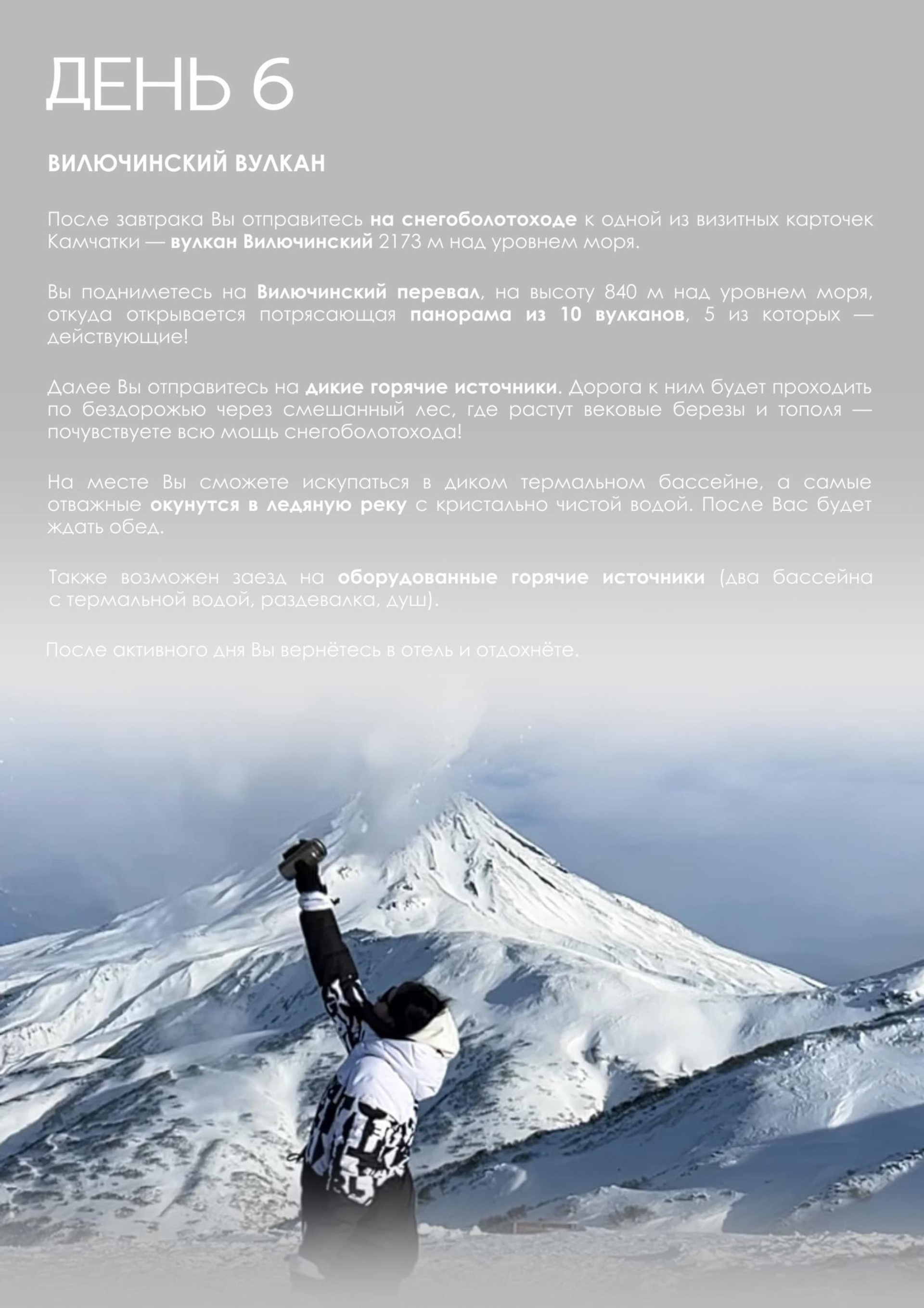 — Мы подготовили для вас уникальный отдых, сочетающий в себе размеренность и активность: вулканы, дачные источники, водопад, каньоны, снегоходы, болотоходы, пикник на черном пляже у океана, сивучи, лебеди и многое другое