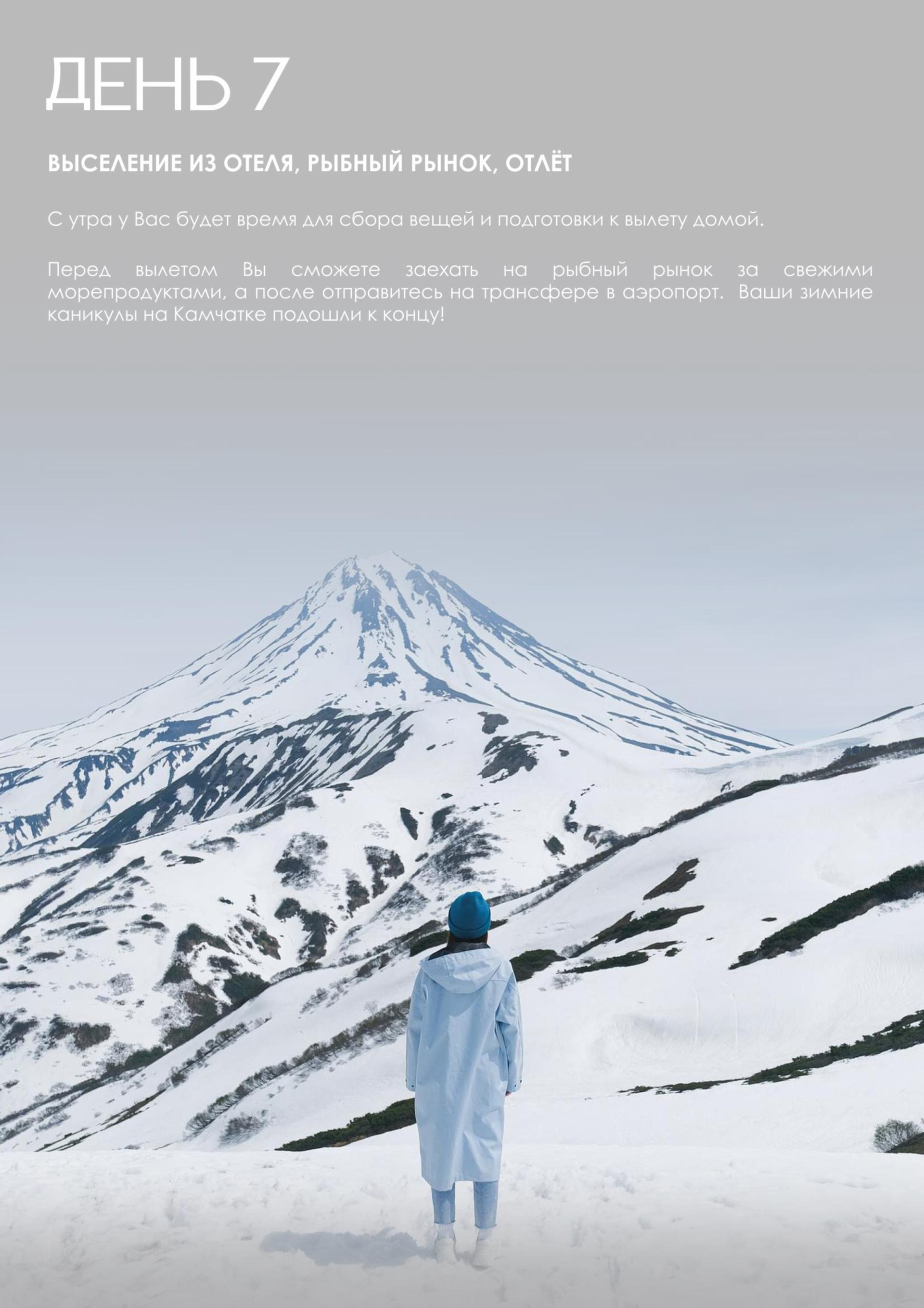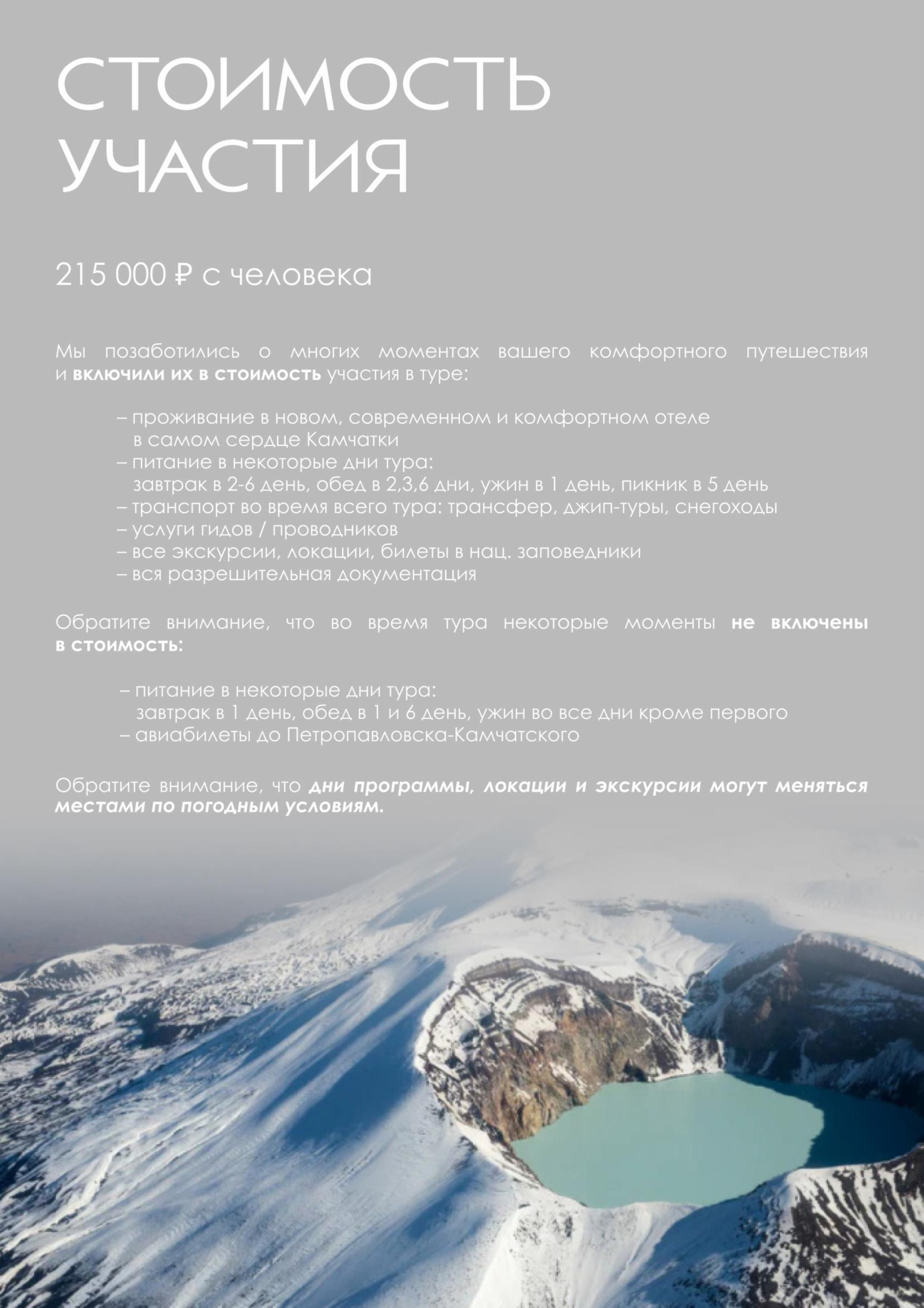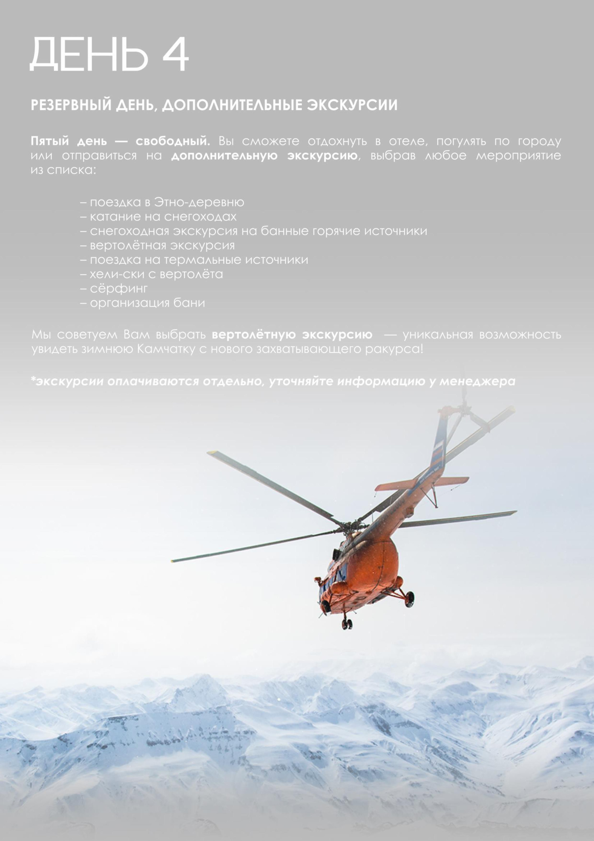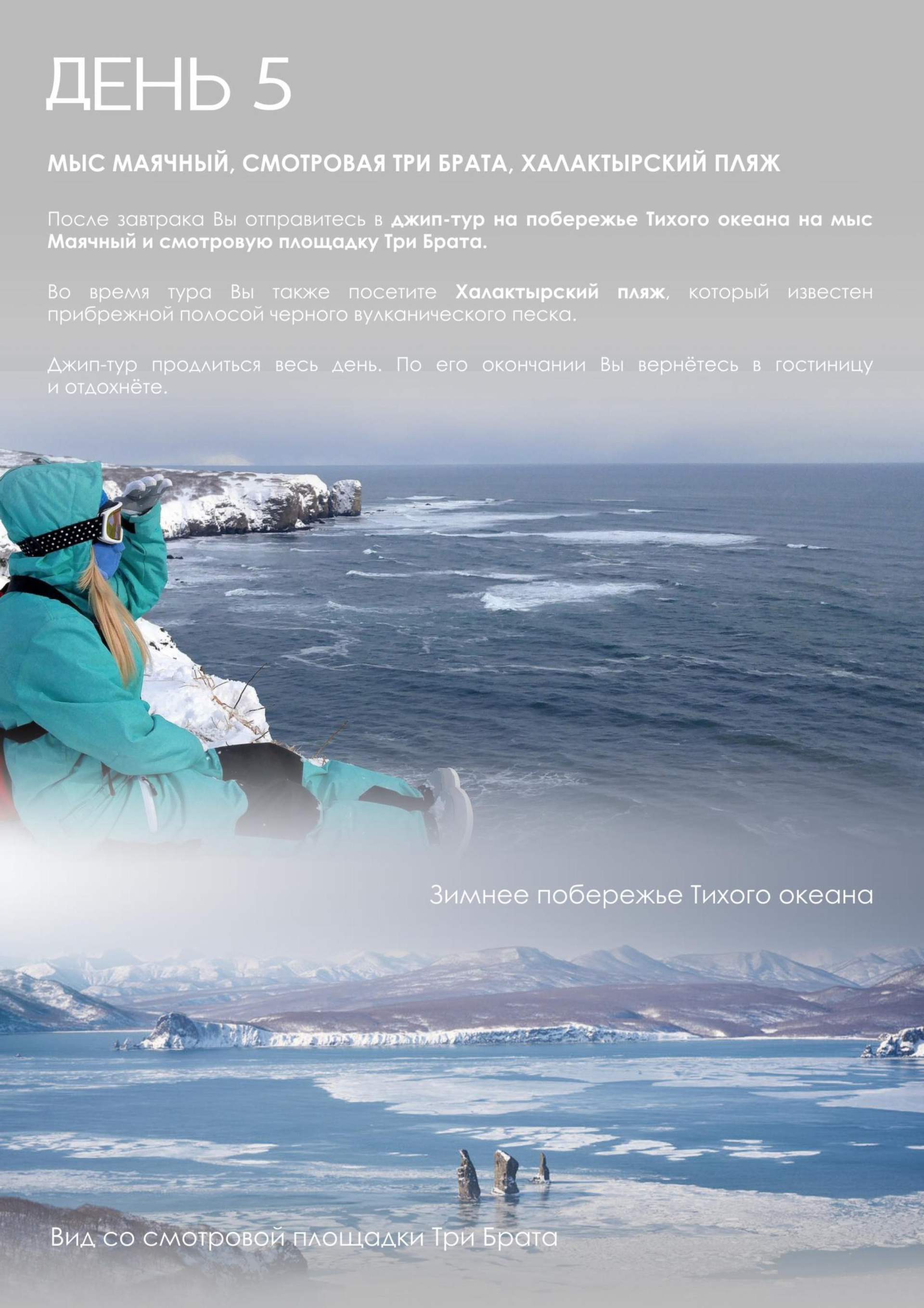 — Мы подготовили для вас уникальный отдых, сочетающий в себе размеренность и активность: вулканы, дачные источники, водопад, каньоны, снегоходы, болотоходы, пикник на черном пляже у океана, сивучи, лебеди и многое другое